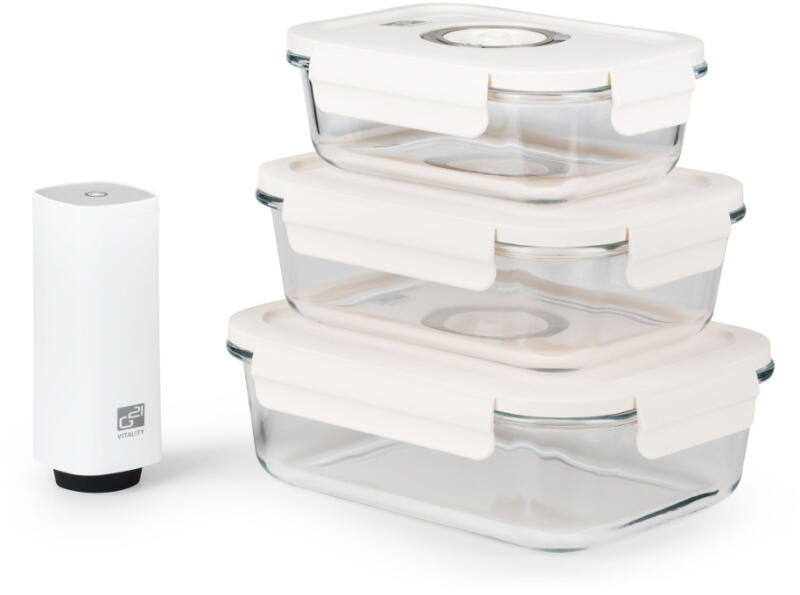 • Teljes készlet – vákuumpumpa és tárolódobozok 630, 1 040 és 1 480 ml-es űrtartalommal